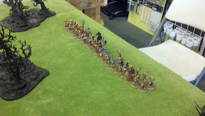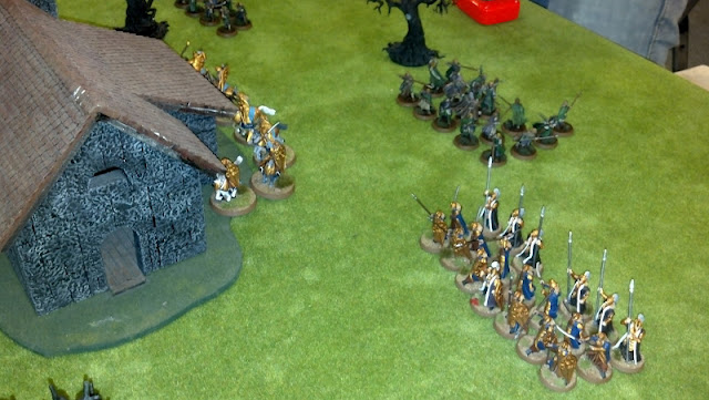 The Elves, however, had also recognized the significance of this lone building and were closing on it with all haste. In the end the two armies reached it at the same time. The corsairs were on the left, sheltering within the Shadow Lord's magical shroud. Nuradan was on the right, with two copses of woods in front of him. The elves had a clear run to the house.