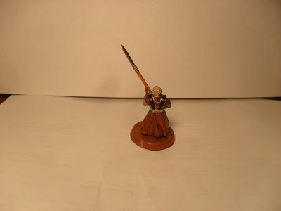This model was easy. Basecoat black. Hit the sword with chainmail. The guard is hammered copper with the hilt being Dark Fleshtone. The highlights are Cold Gray with two washes of Badab Black and one of Leviathan Purple. Quick, dirty, table top quality. I'll do the base when I do the rest of the army. That's always my last step, though I did glue sand on this one already.
