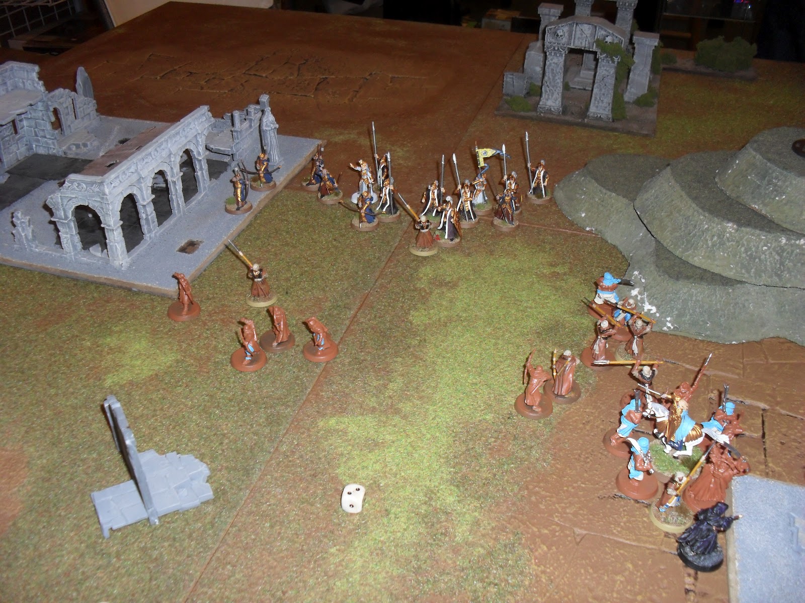 | Initial Deployment. The Taskmaster's ill fated band is behind the ruins to the left. You can see the hornblower. |