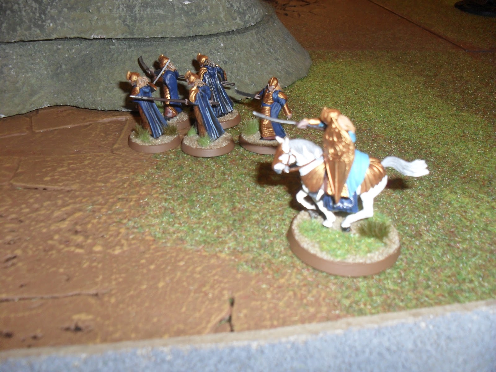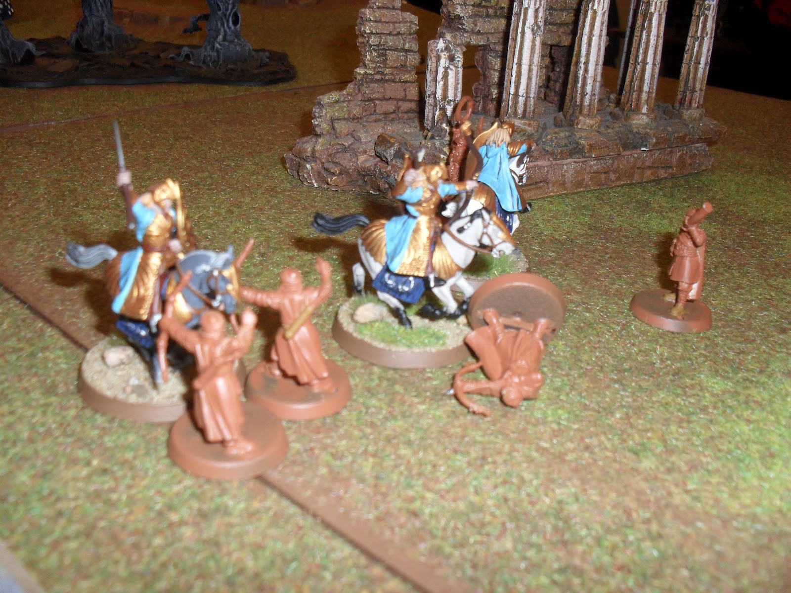 | Here's the mounted contingent, short on mounts at this point. The other two knights with the captain just got killed, one by a failed thrown rider test. |