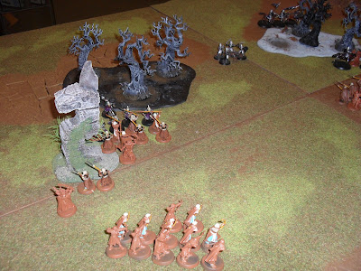 Micah rolled a 1, "To the Death". This scenario is a full on knock down, drag out death match. You get points for breaking your opponent and not being broken. You play to 25%. You get points for wounding the enemy commander and more for killing him. You get points for having standards on the table. This last one is a half assed attempt by GW to get people to take banners. The actual way to do that is to make the rules for them attractive. If they worked at six inches, I'd take them. With a three inch radius, they are not worth it. I digress. Rant concluded. The other interesting factor in the new scenarios is deployment. I placed first. It's an "I go, you go" deployment. I rolled and got a one so I had to place my first warband in the 12" closest to the center of the table. On a 1-3 you have to place in the center 12". On a 4-6 you can place anywhere on your side of the table.