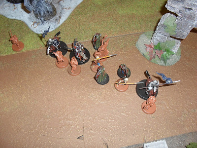 I next placed the rest of my spears, with the Taskmaster, on the left flank, in front of the archers. Micah made his last drop by putting his dwarfs behind a piece of scenery just in front of the Taskmaster's band. This is where I made the decision that determined the rest of the game. I put my Mahud right in front of the Rangers, separated by one inch.