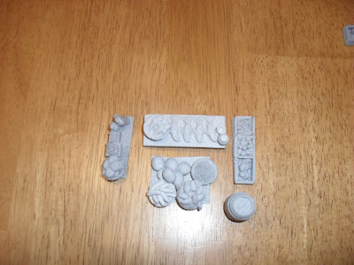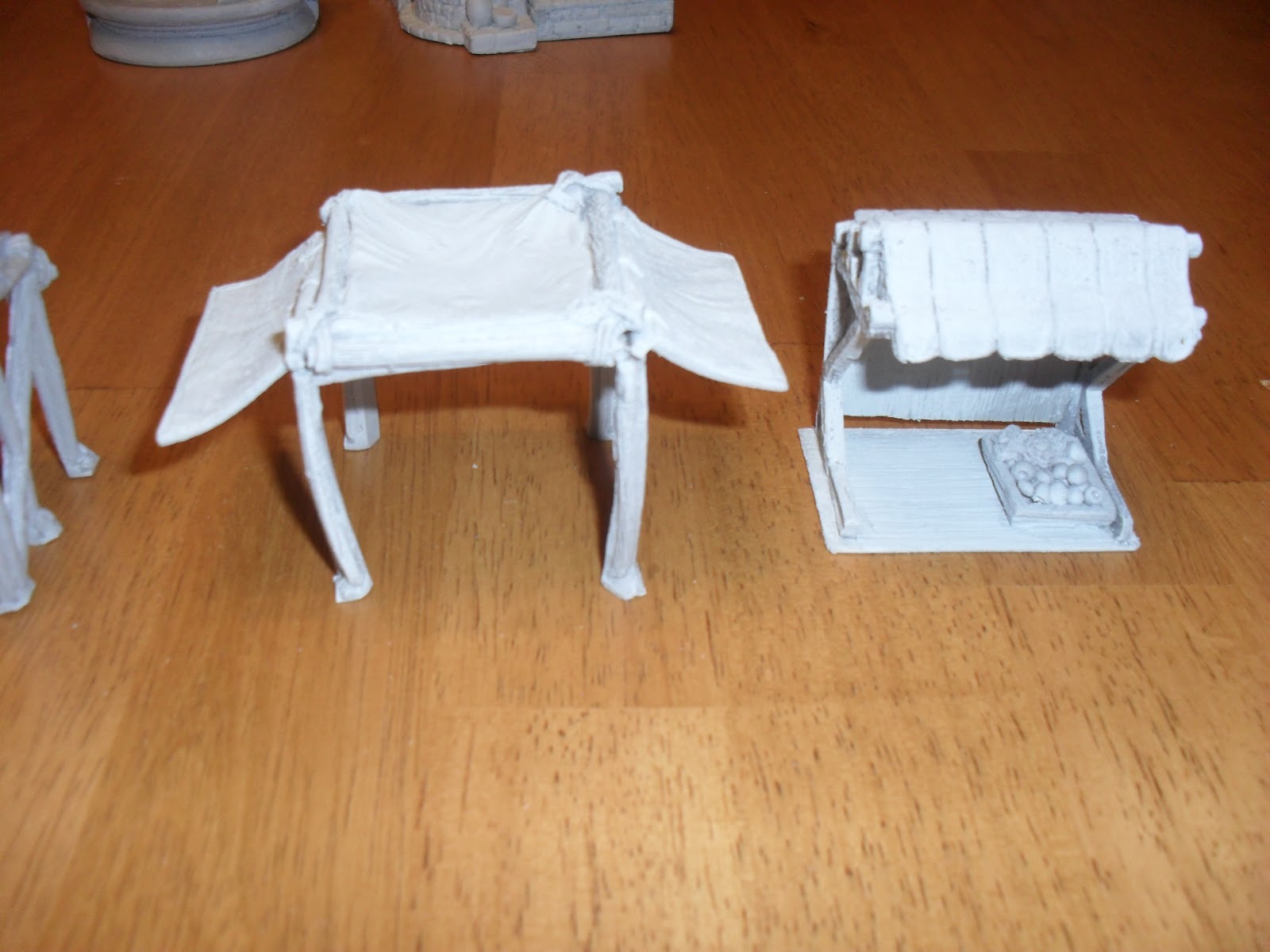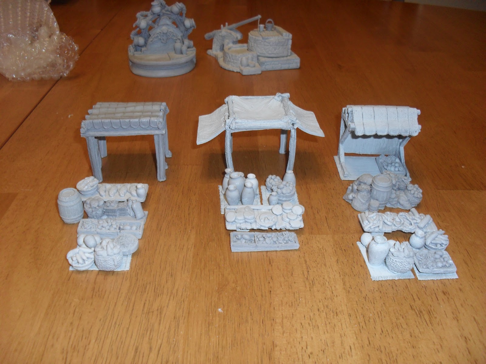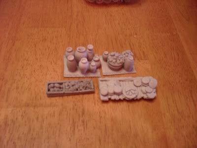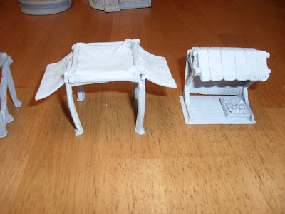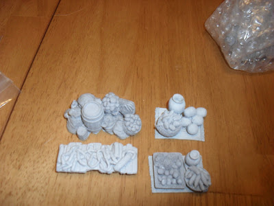 Production Value: 9/10. There are a couple of air bubbles in easy to see spots. some of the pieces are very fragile and will require some careful basing to ensure they survive gaming. (see the carpets with goods on them below). Having said that, these look great. The castings are clear and well detailed. You can identify what each of the vegetables is. the wood grain on the posts is clear, the small details all look great.