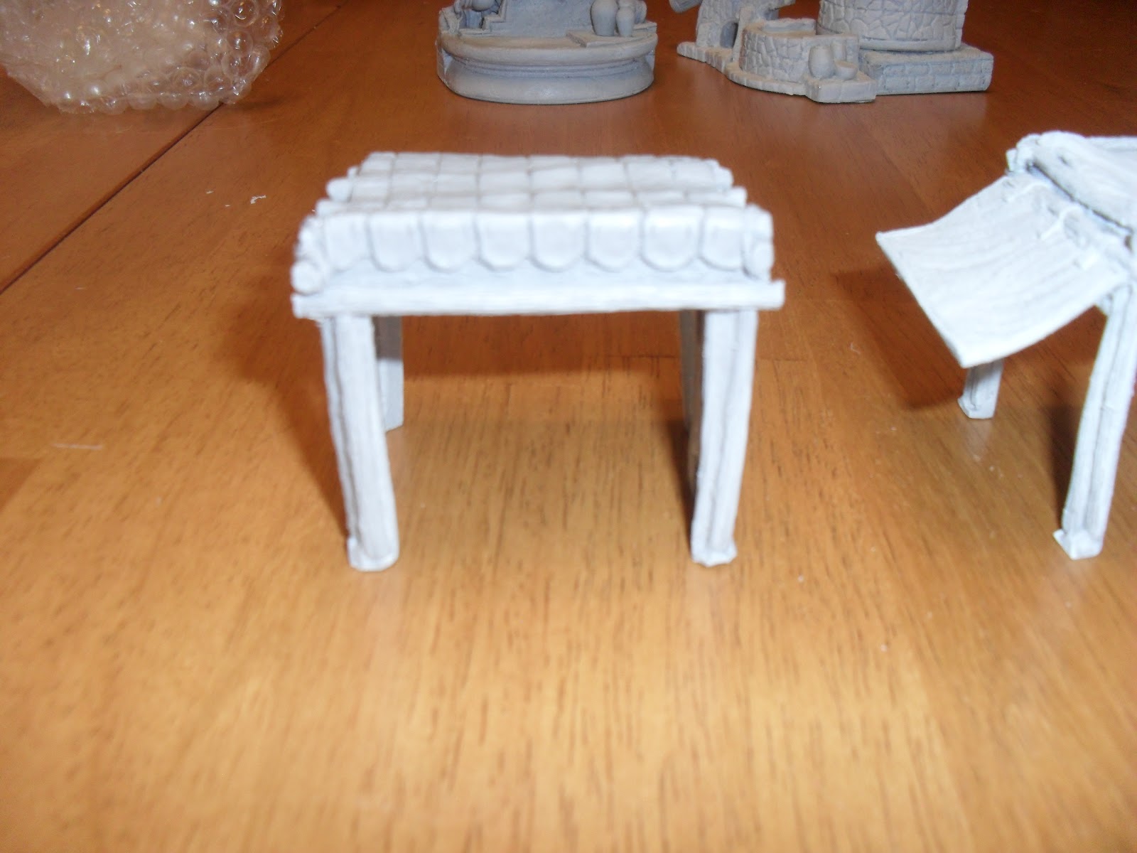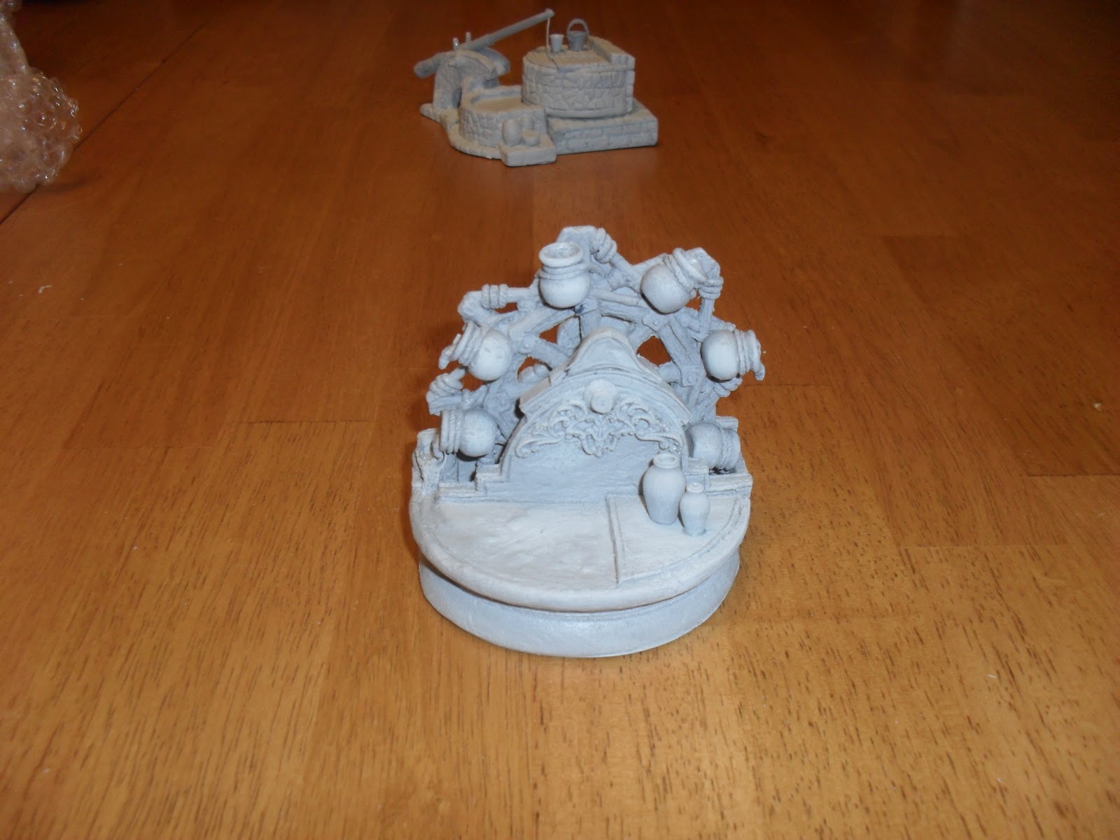 Product Description: I ordered three items, the two different wells and the market stalls. All of the pieces are resin. The casts are very good, with only a couple of bubbles across all of these pieces. Both wells are two pieces. The market stalls are each a single piece, three stalls. Each stall also comes with a huge amount of wares to be laid out around them. All of these are 28mm scale.