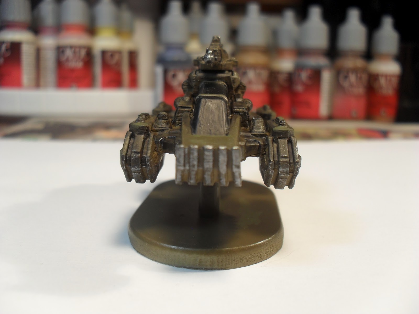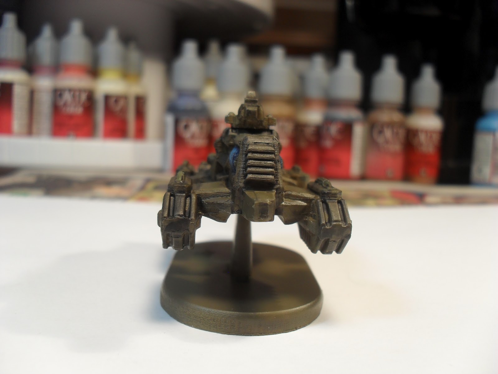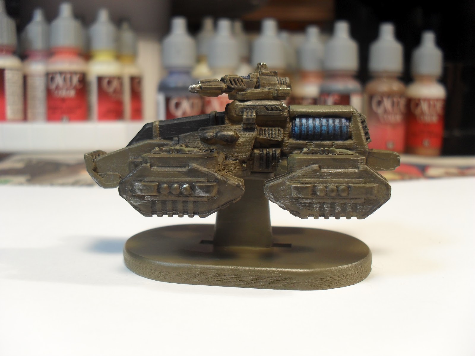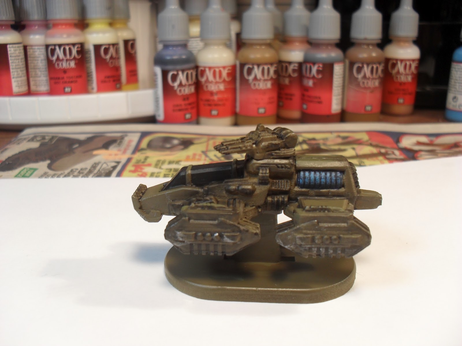 I primed it with FoW US Armor, and did a Badab Black wash over everything. The canopy was painted black. The fusion can was hit with Vallejo Imperial Blue then highlighted with Vallejo Electric Blue. The scratched paint is Vallejo Gunmetal Metal. I touched up some spots on the base coat with FoW (Vallejo) Brown Violet (887). Done. Bob's your uncle.