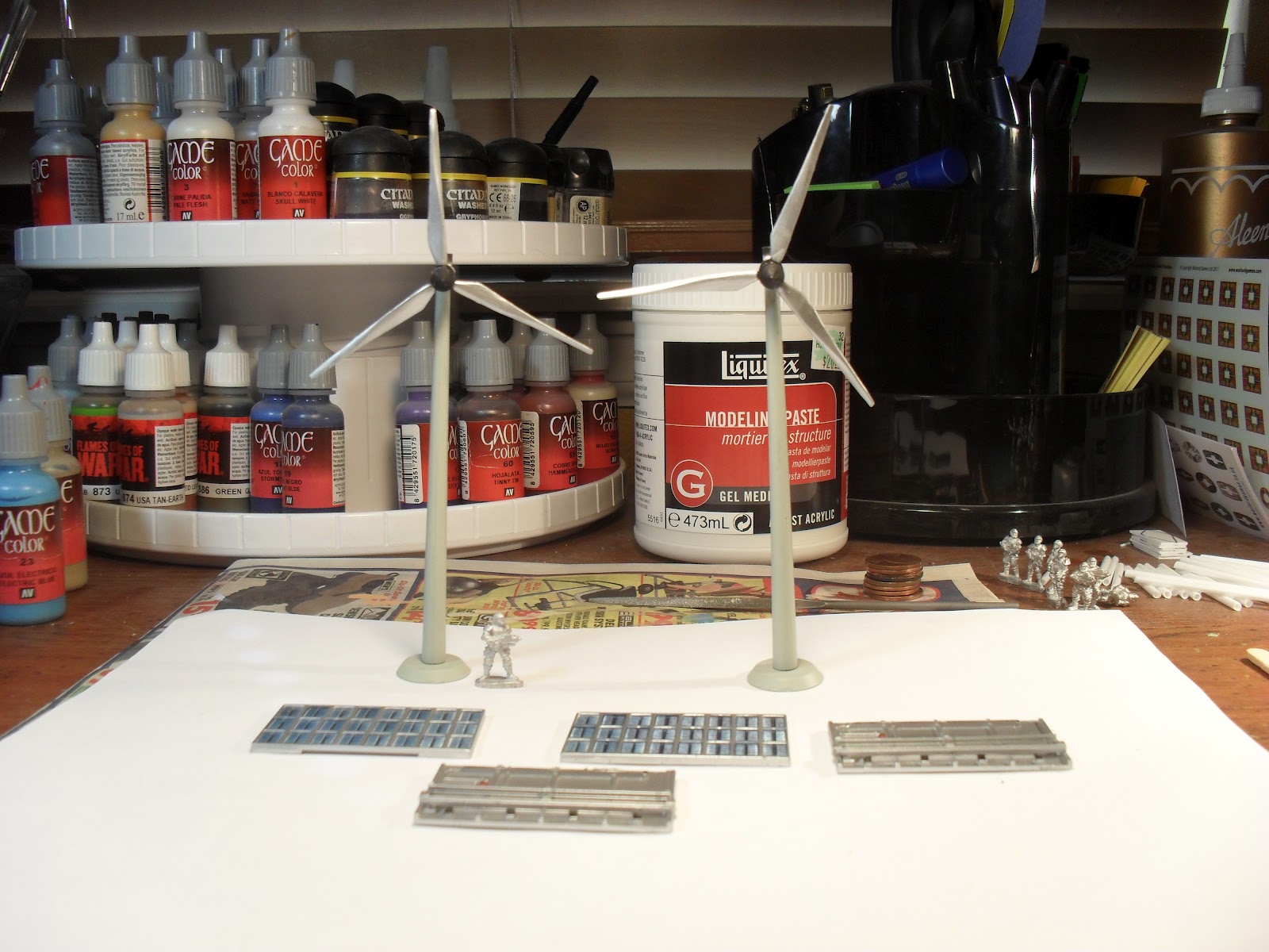 On the financial front, let's see... I bought the 15mm from CMG and then the lot from Rebel. I have still not received my order from Defiance Games, though they say they are shipped so they should be here any time. I'm hoping these are nice minis since I'd like to support the company and I need something to fight my IG. I also ordered a copy of Tomorrow's War. Other than that it was mostly hobby supplies; tufts, flowers, liquitex, not-GW plastic glue and two new Winsor & Newton Series 7 brushes. I have a friend whose daughter works at an art supply store and gets everything for 40% off. So far I'm pleased. I also got one set of terrain for 15mm. The wind turbines and solar panels set.