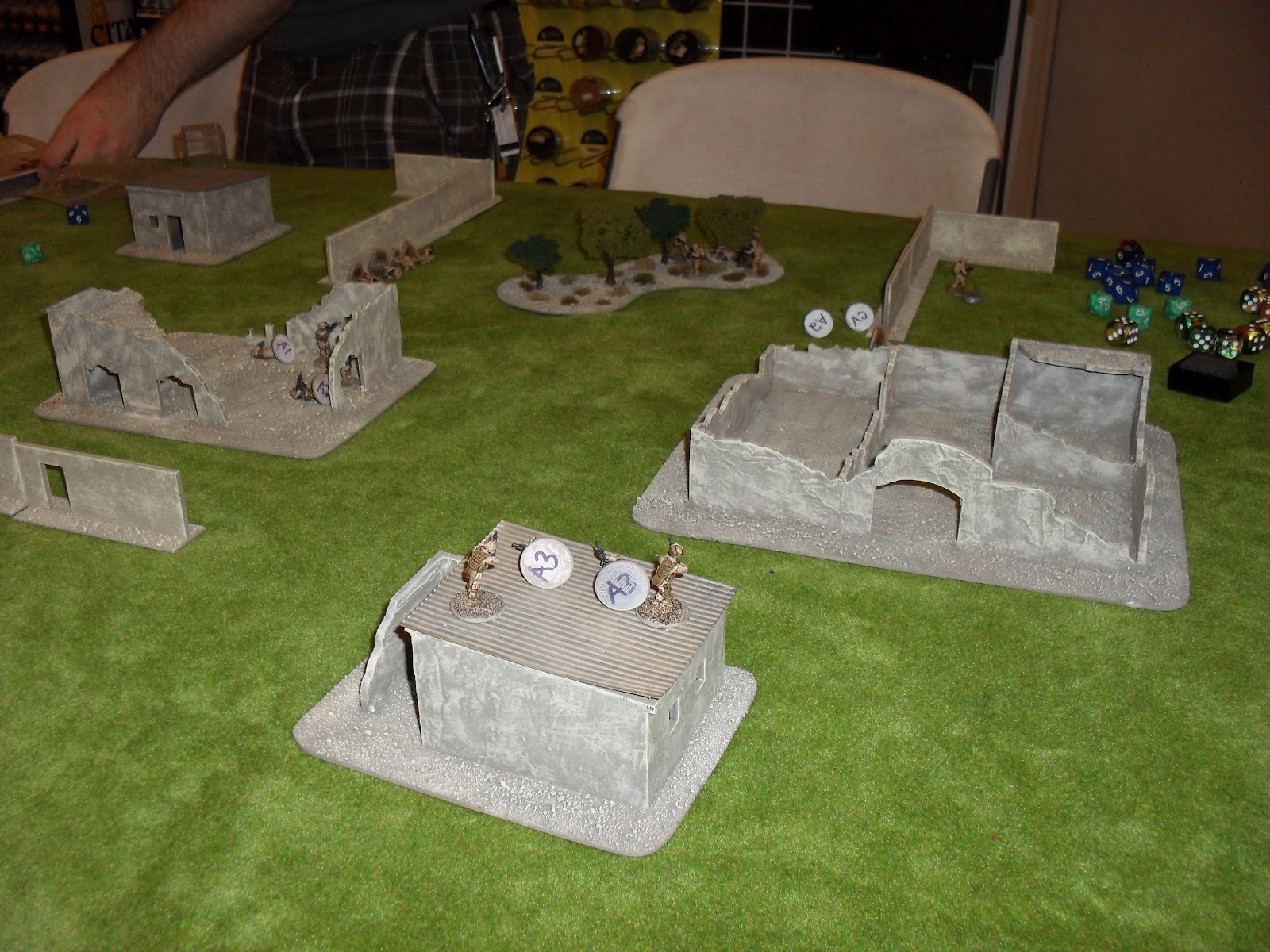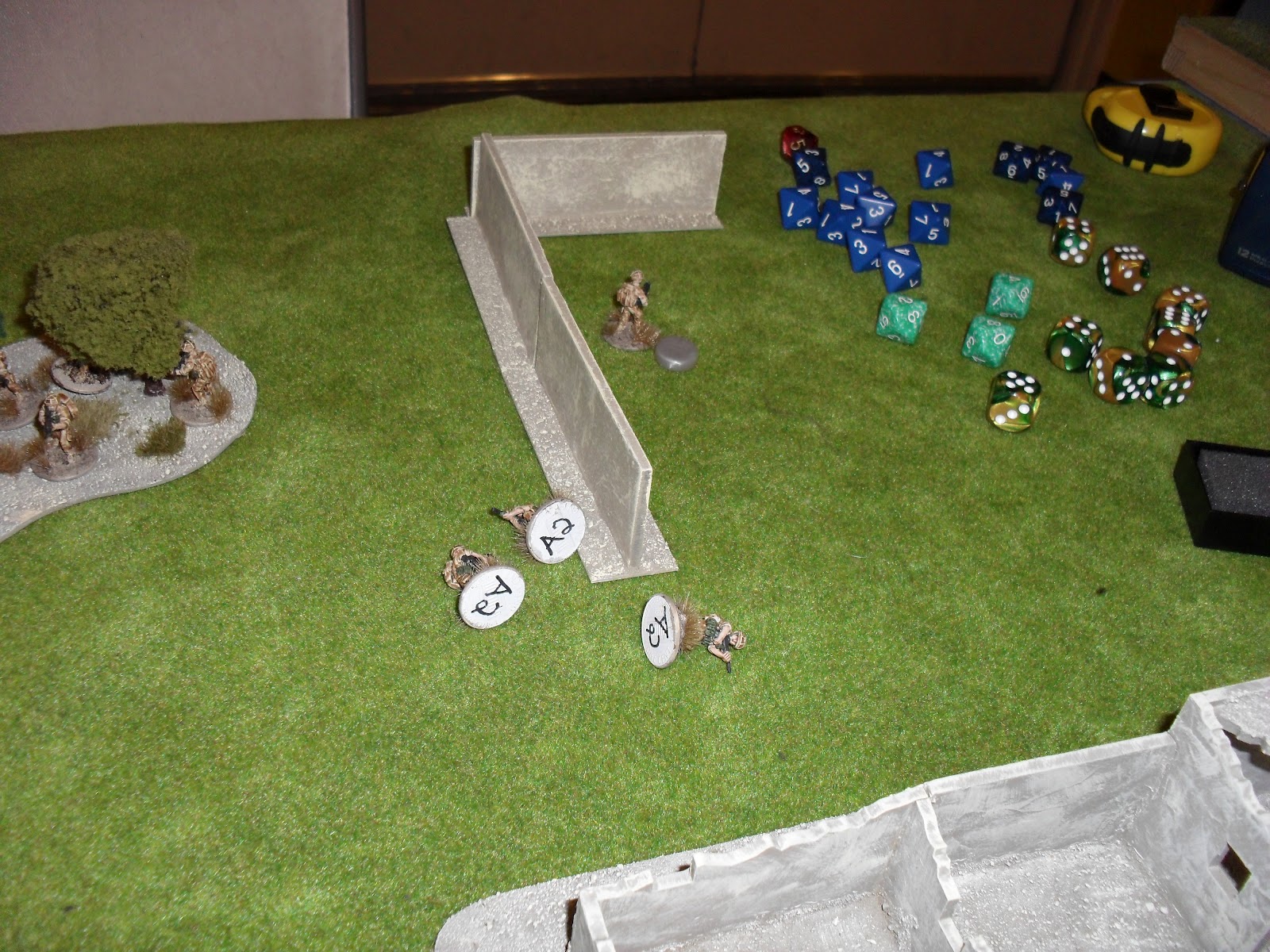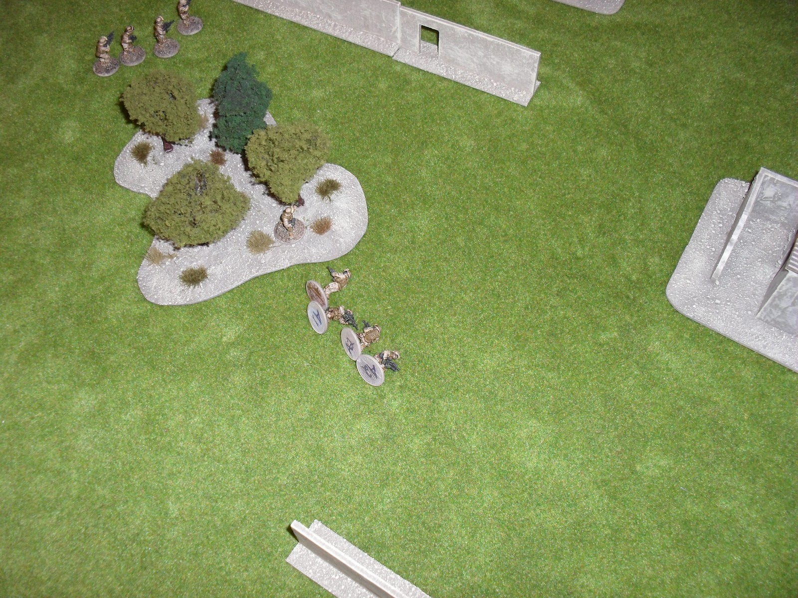 Nick gave me a quick overview of the rules and we started out. I got initiative, which is very helpful in this game. As in real life, the side with initiative gets to set the pace of the battle. I advanced my forces, two teams up the center and one around my right flank. This is when Nick explained opportunity fire (it might be called something else), and demonstrated it by killing all of one of my fire teams. Lesson learned. I like the way that played out, from a gaming standpoint, not a tactical standpoint. Tactically I lost a third of my force on the first movement. Suck.