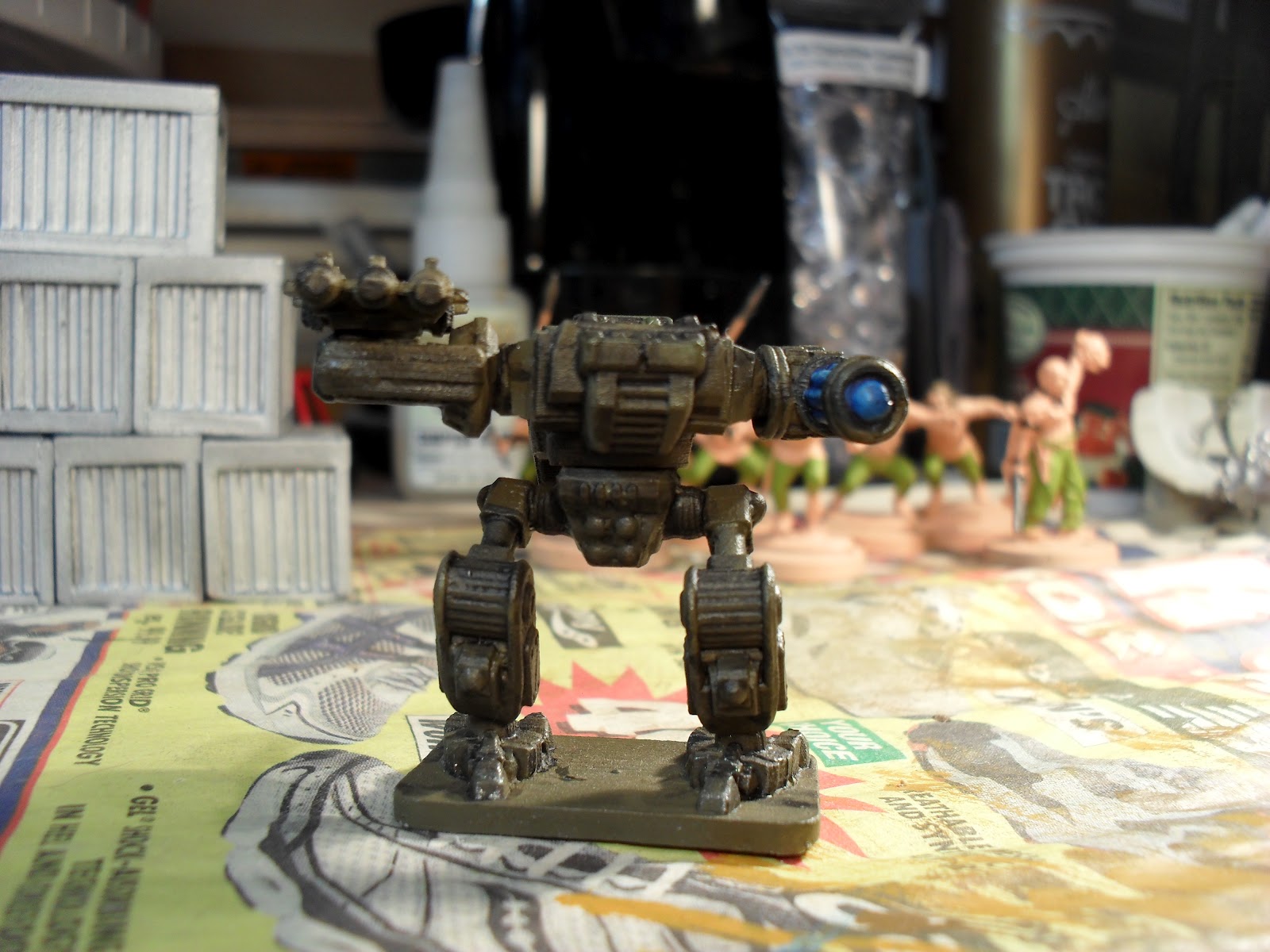 These were primed with FoW Army Painter US Armor. I then washed them with GW Badab Black wash. The metal and the places where the paint has been scraped off are Vallejo Game Color Gunmetal Metal. The warheads on the missiles are Vallejo Scar Red. The lasers are Vallejo Electric Blue, washed with GW Asurman blue and then highlighted with Electric Blue again. The cockpit is Vallejo black.