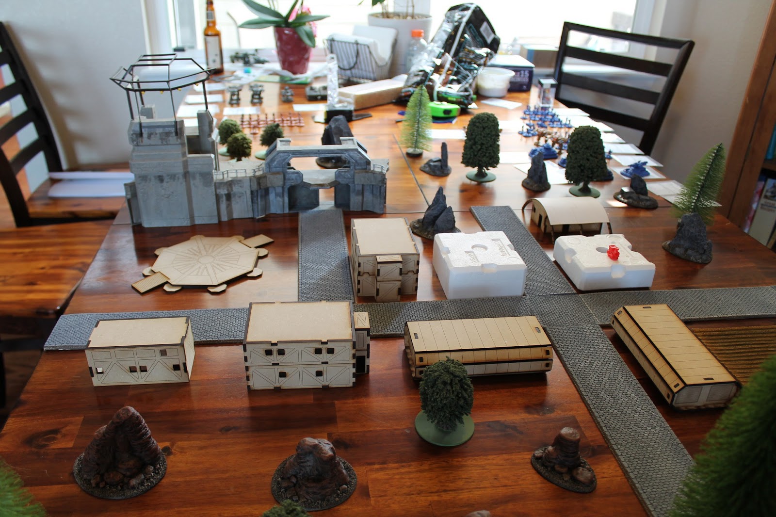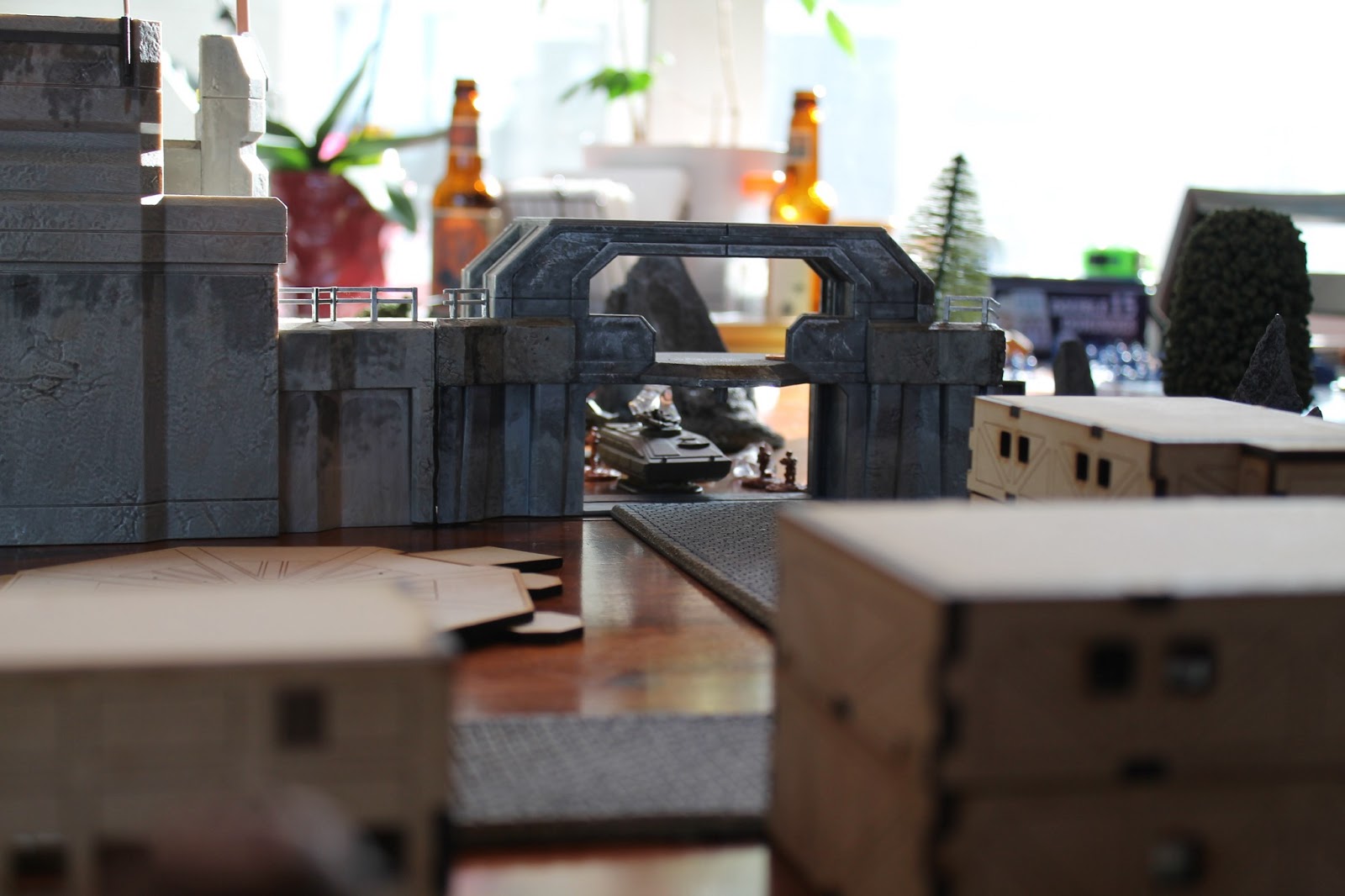 There were four objectives, the train pieces. One was in the bunker, requiring three successful skill rolls to hack and get open. The other was in the interior of the tower. The two others were in a random terrain piece, a successful skill check by a unit in contact with the brown pieces or the granite pieces, one per side.