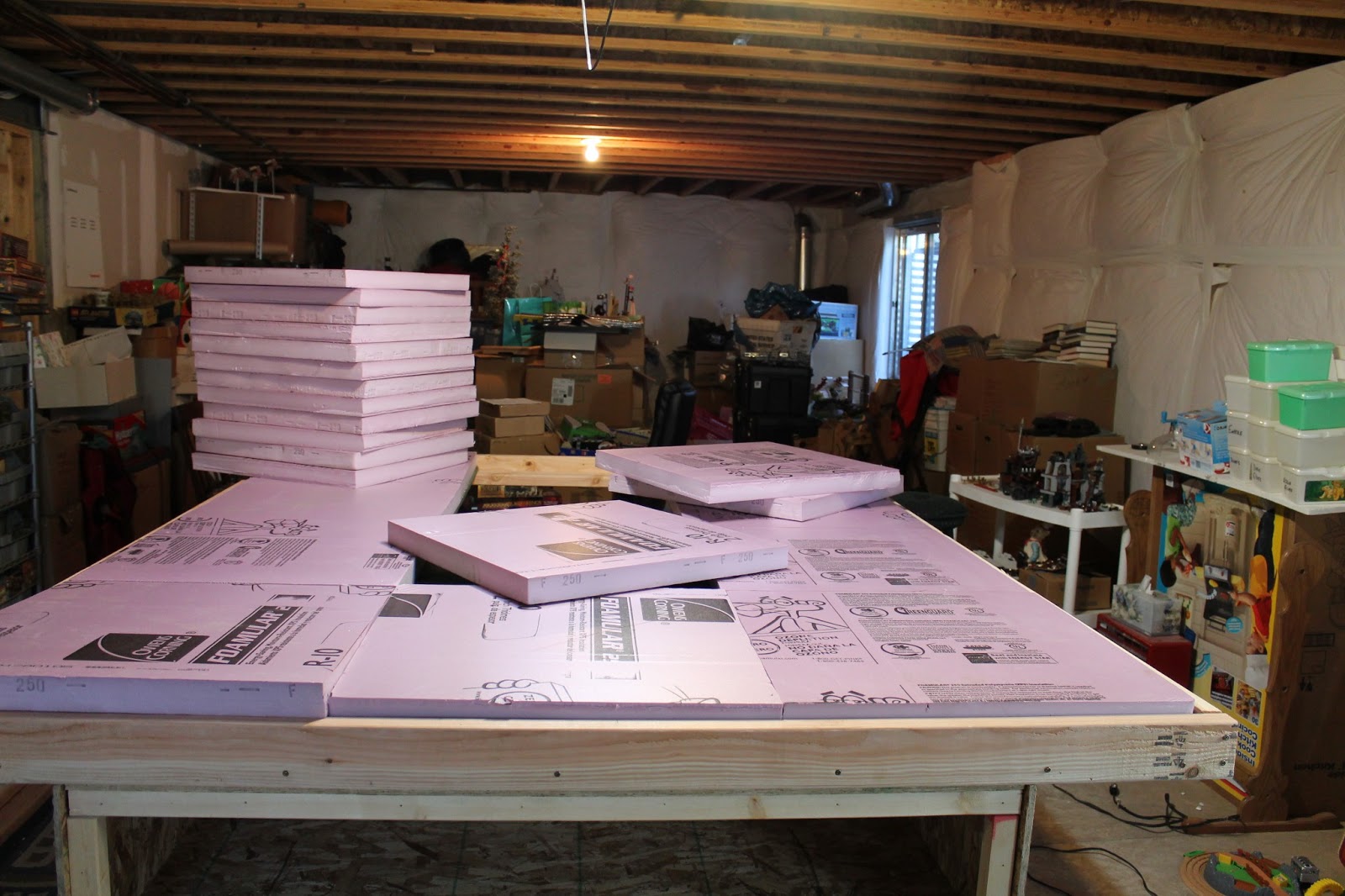 The rest of the table is a 2x4 framework. 1/2 inch plywood lays on top of that. The table is six feet across and eight feet long. The pink foam tiles will need to be trimmed to fit, but I can do that with my hot foam cutter. I have 24 2" deep tiles, which is enough to cover the table, build some tiles with built in hills and still have a bunch left over to switch them out.