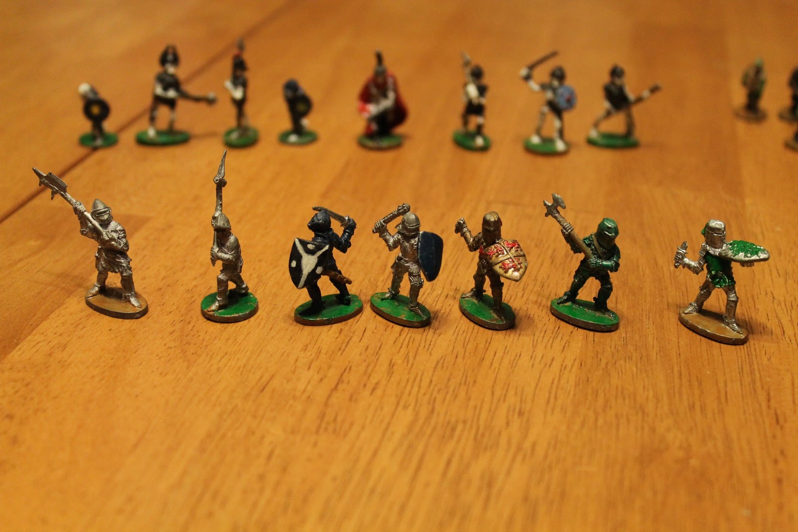 The first group were foot knights and men-at-arms. These were probably meant to be adventurers, though I can't remember. They had a variety of styles of armor and different weapons. They were all painted differently. You can see my painting style is developing as there is more than one color on these models.