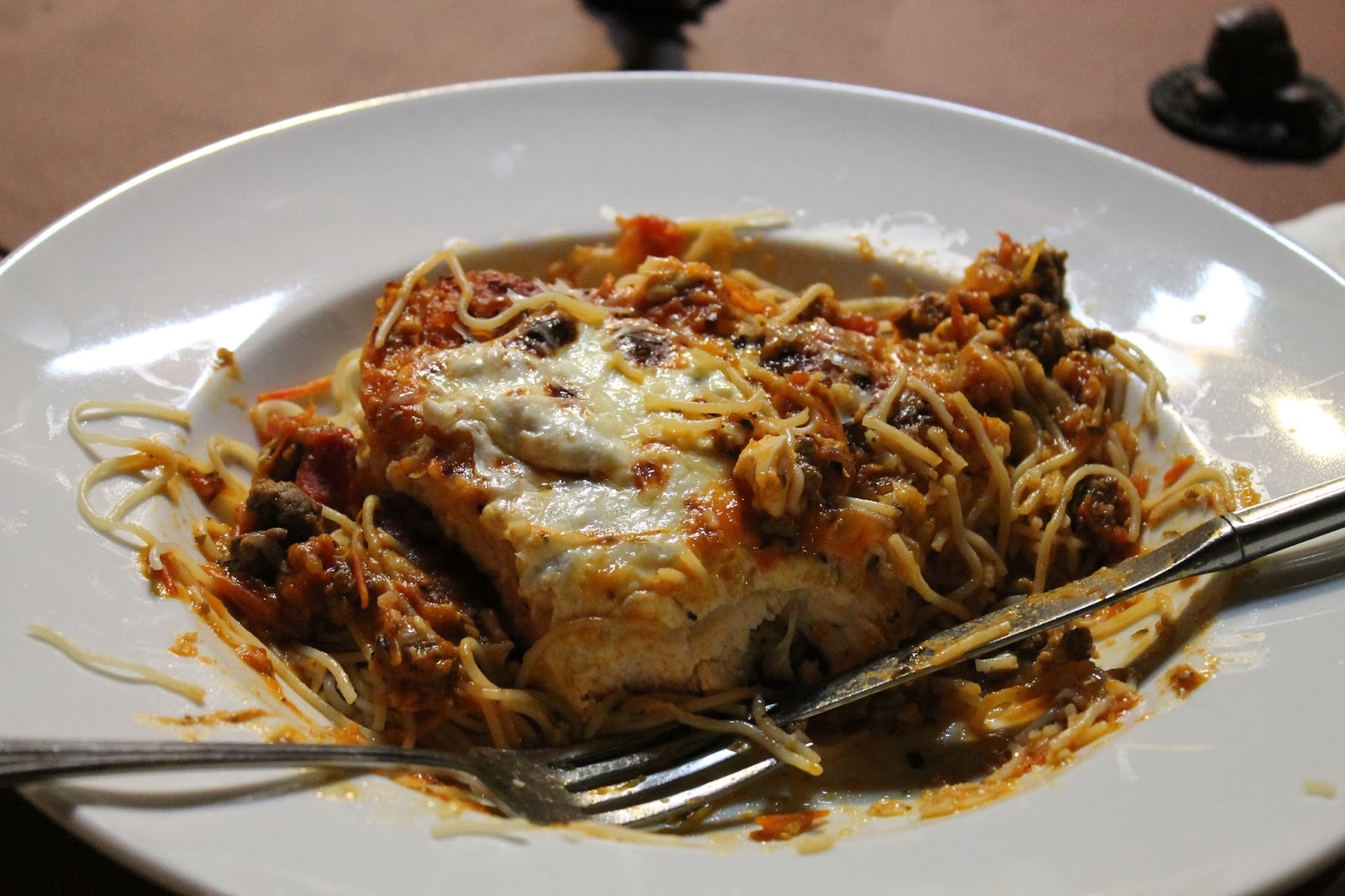 | Dinner. Home made chicken parm. The sauce all came out of our garden. My wife is great. Tony was duly impressed with her cooking skills, which pleased her, so it was a win for all of us. |