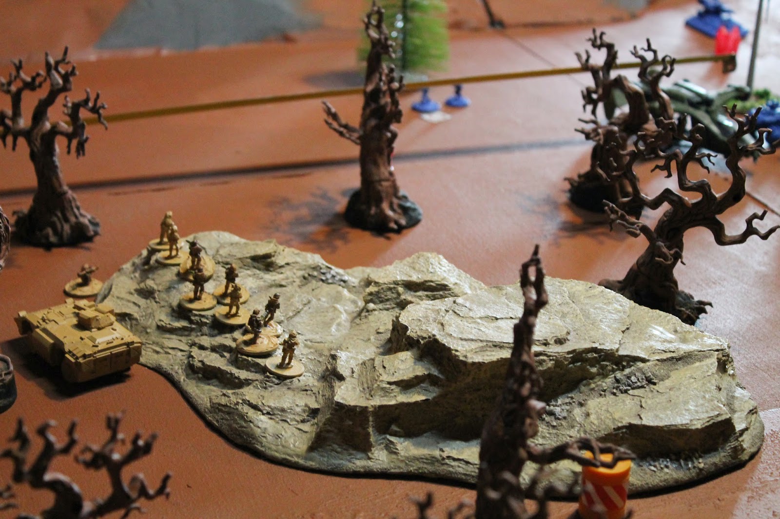 | An infantry squad moves around the left flank and takes position in some rocks. |
