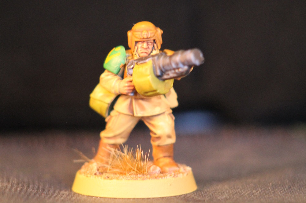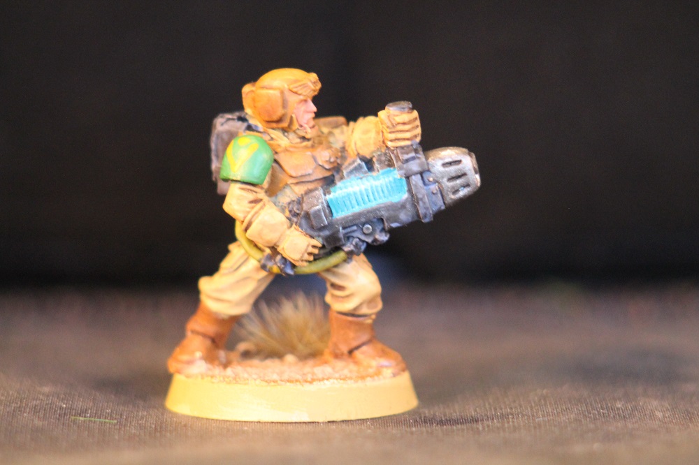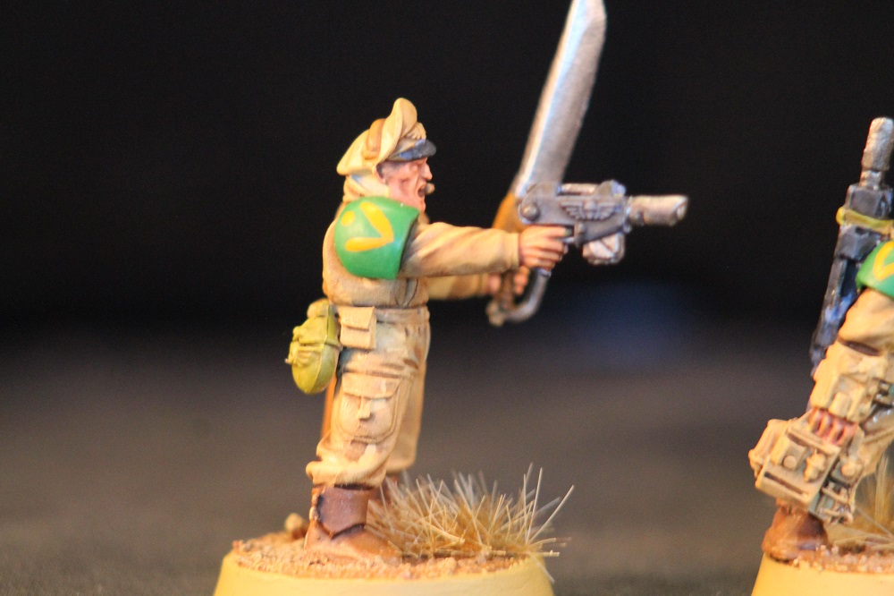 The odds and ends are a dismounted armor officer, Vox-caster, missile team, melta gunner, plasma gunner, two grenadiers, two flamers and a Corpsman. The bases are done in my standard desert pattern.