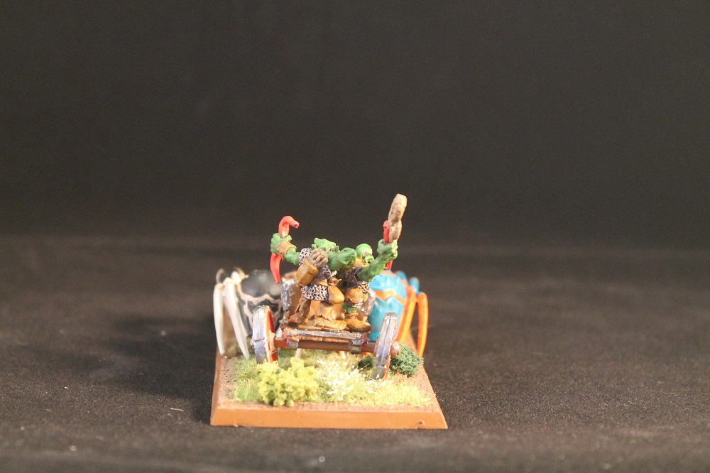 I wanted to present this chariot as a rather desperate affair in construction, but blinged out for all the gobbos are worth, because they're awesome for getting to ride to battle and not walk.
