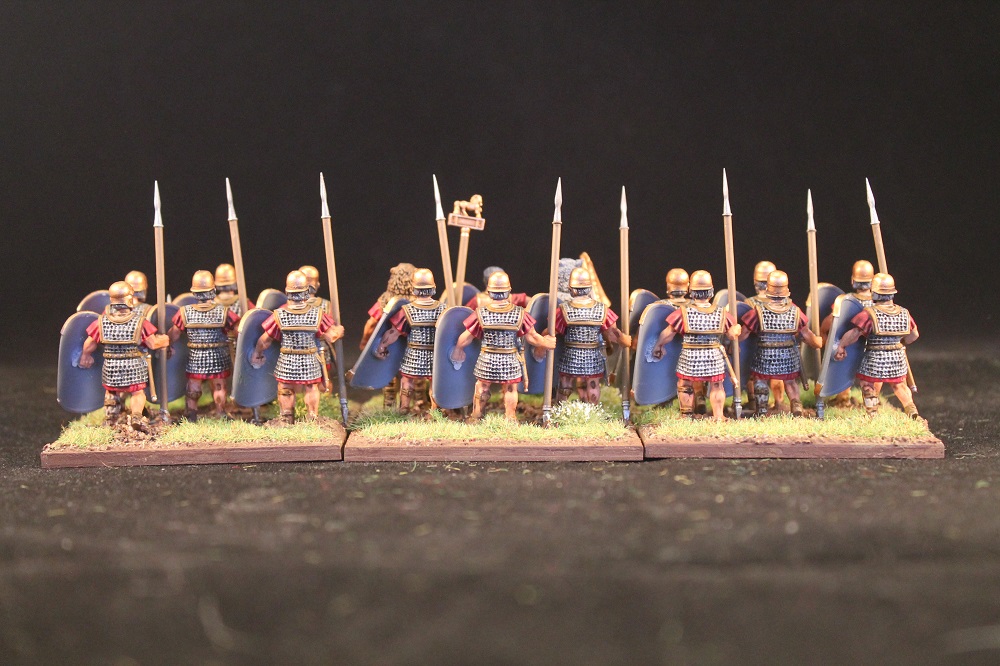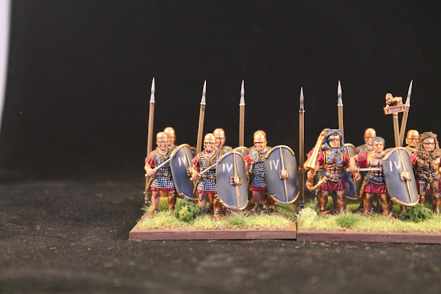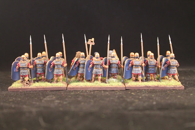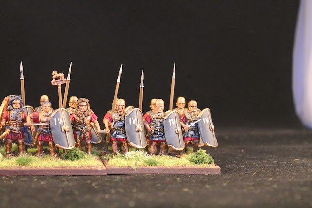 This is my final post of the Challenge. Eighteen Early Imperial Roman Medium Auxiliary Infantry from Victrix. The savvy among you will recognize that Victrix doesn't make that set. These are actually their Republican armored infantry. I cut the feathers off of the helmets and used them as is from there.