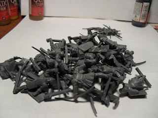 Here is the pile of Warriors straight off of the sprue. They look bigger in a nasty pile like this. It makes me happy and sad. Sad because I have to clean mold lines off of all of these. Happy because it is 24 more dudes for my army.