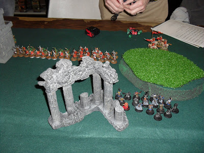 Keith eventually got tired of the long range archery duel, which he was losing, and moved Dain and his entourage around a ruins to try and hit part of my line.