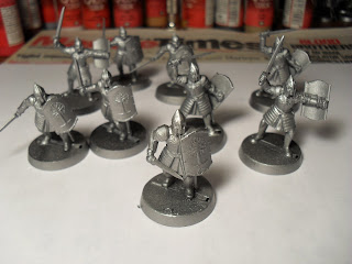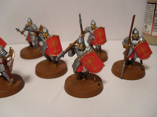 I also completed my first Warrior of Minas Tirith. I have not dipped him yet though. That will probably happen tomorrow. I started on base coating his fellows. Eight warriors with shields and eight with spears as well as the six Knights. There are also the three command models, Captain, banner and horn. I will need to buy another box of Warriors of Minas Tirith and the army will be complete.