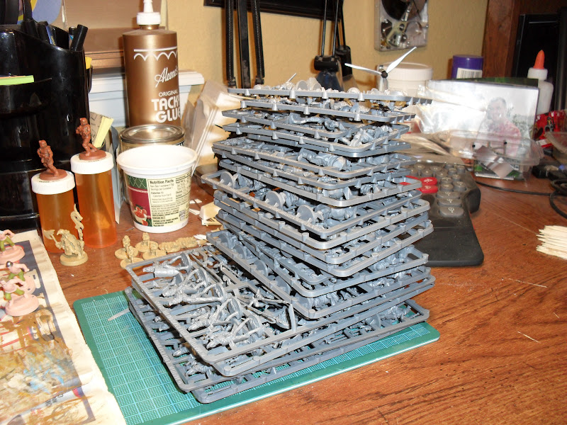 I've been out of action for the last two months. The blog's been quiet because I have not done anything hobby-wise. My shoulder is starting to feel better, at the same time that I have a week off of work. I'm trying to get a whole bunch assembled so that if the weather gets nice enough, I can get it primed. I have a fair bit primed already, but most of it is not for any current project; rather they are artifacts of past attempts to paint armies.