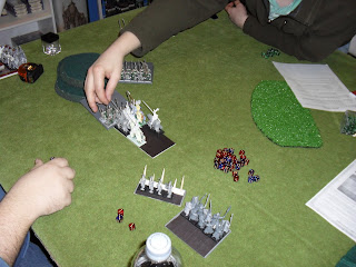 Thursday night I actually played a game with my Gondor. I was playing against Keith's Fiefdoms army with Imrahil, Beregond and a mounted Captain of Dol Amroth leading four Knights of DA, a bunch of foot Knights, some Rangers of Gondor, guards of the fountain court and Men-at-arms of Dol Amroth.
